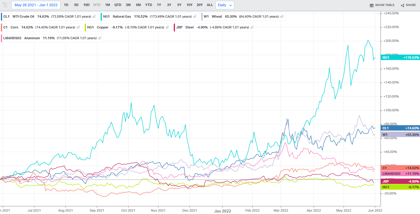 그에 반해 철이나 구리 등 금속 가격은 3, 4월을 정점으로 하락 전환을 하고 있다. 특히 구리 가격은 실물 경기 상황을 잘 반영하고 있다고 하여 닥터 코퍼라는 별명을 가지고 있을 정도로 적중율이 높다고 하는데 실제로 경기가 3, 4월을 기점으로 하락 전환하고 있는 거라면 인플레이션이 지속적으로 상승하는 상황에서의 경기 하락이므로 스테그플레이션의 진입으로 볼 수도 있다. 인플레이션의 영향이 작년 말 부터 6개월 넘게 지속되고있고 당분간 그 방향이 유지된다면 그 관성이 쉽게 꺾이지 않을 것이다.