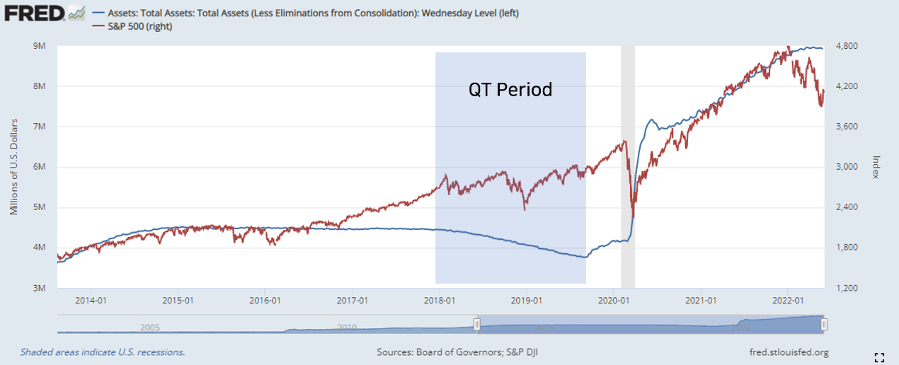 사실 양적긴축이 처음하는 일은 아니다. 2008년 금융위기 상황을 빠져나오기 위해 임시 방편으로 수행한 3단계에 걸친 양적완화를 종료하고 2017년 4분기부터 약 2년간 양적 긴축을 진행하며 7000억 달러를 회수하게 된다. 그러나 같은 시기에 시중 은행에서 그 이상인 8000억 달러를 시장에 공급하면서 유동성 위기는 발생하지 않았다.