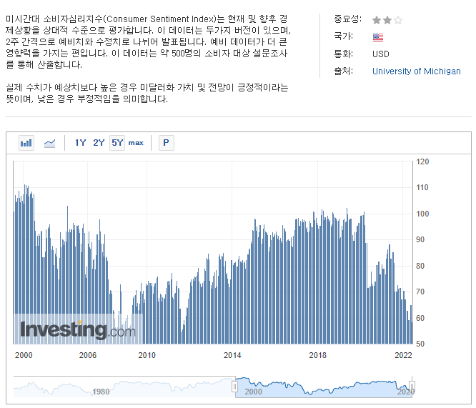 가처분소득이 하락 반전하며 계속해서 줄고 있어서 그런지 소비자 심리지수는 쉽게 나아지지 않고 있다. 미국 정부와 연준의 의도대로라면 미국의 소비가 살아나야 하지만 인플레이션과 가처분소득 감소로 소비자 심리는 2008년 금융위기 전 수준으로 악화되고 있다.