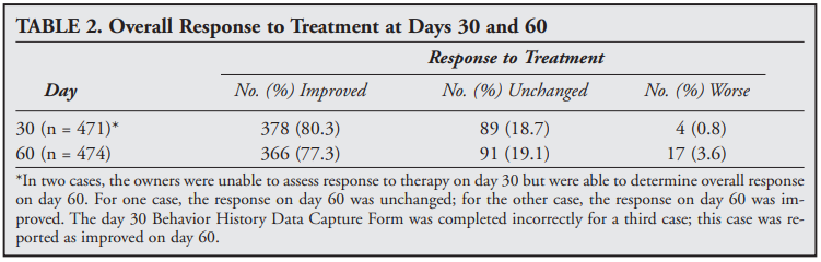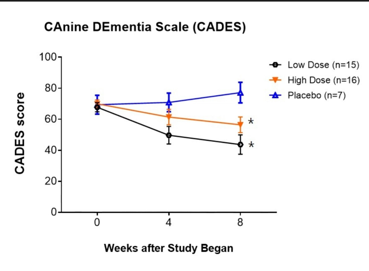 각기 강아지 치매 증상에 대한 설문 결과가 대조군에 비해 개선된 효과를 보인다. 이 점은 상당히 긍정적이라고 할 수 있다. 치매의 경우 2 단계의 효과를 고려해 볼 수 있는데, 우선은 증상이 악화되지 않게 하는 것이며 다른 하나는 개선(치료)의 효과가 있느냐 하는 것이다.